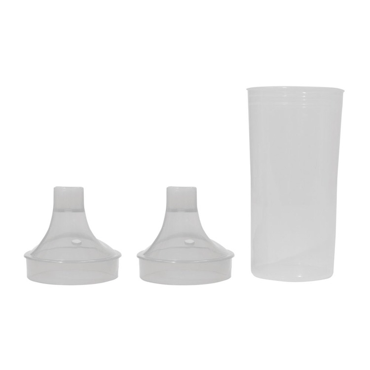 This specially-designed cup is supplied with two tops, one with a small hole for drinking fluids and the other featuring a larger hole for more solid food.