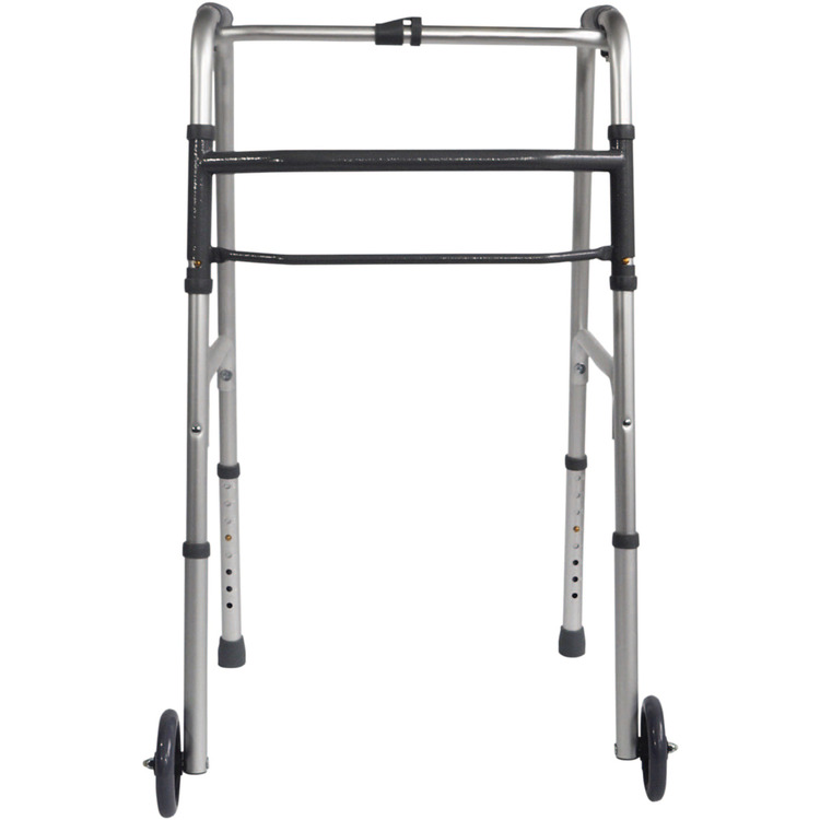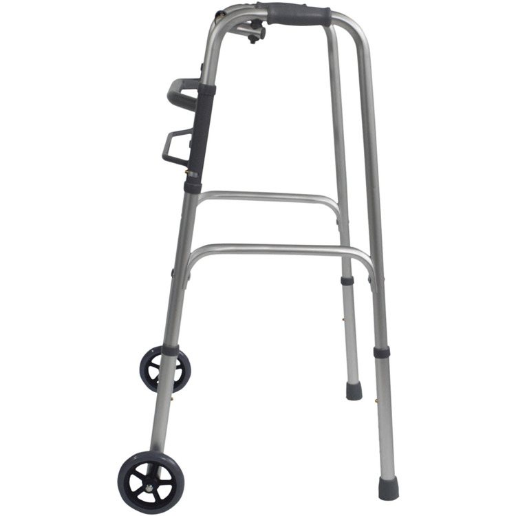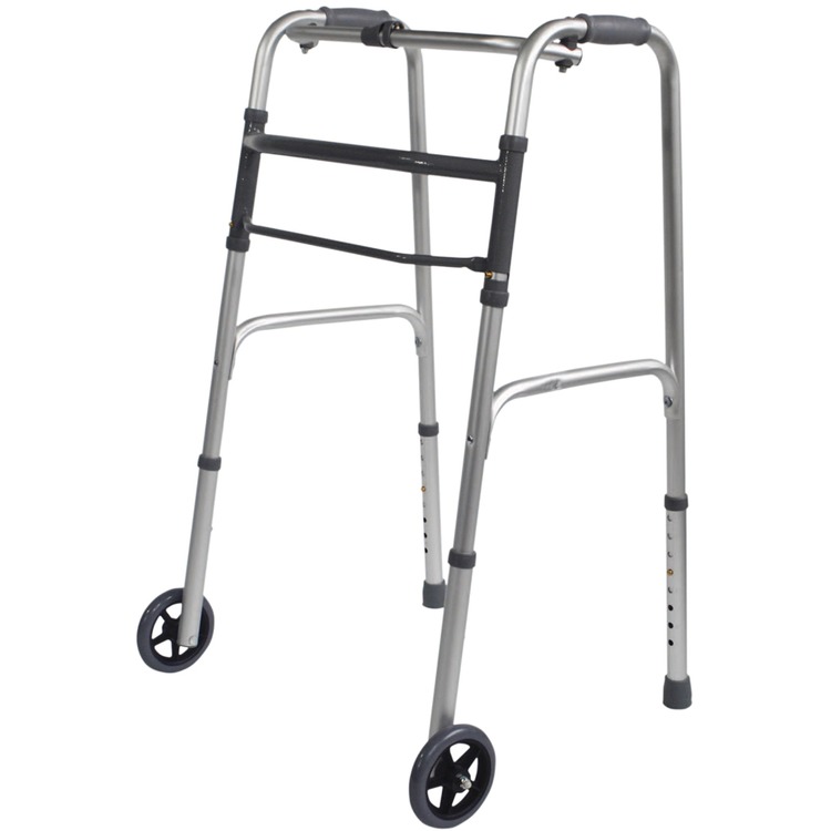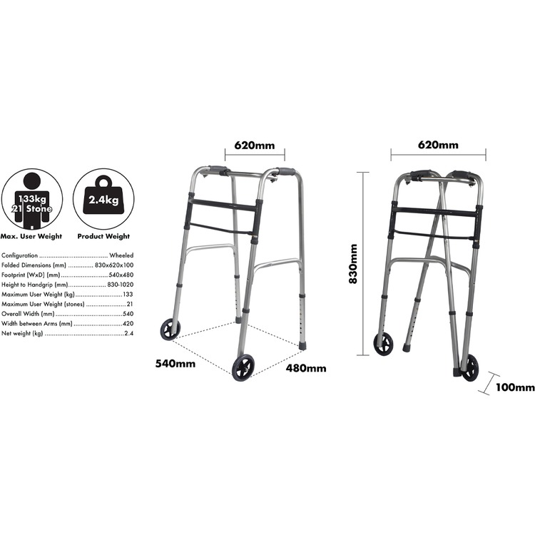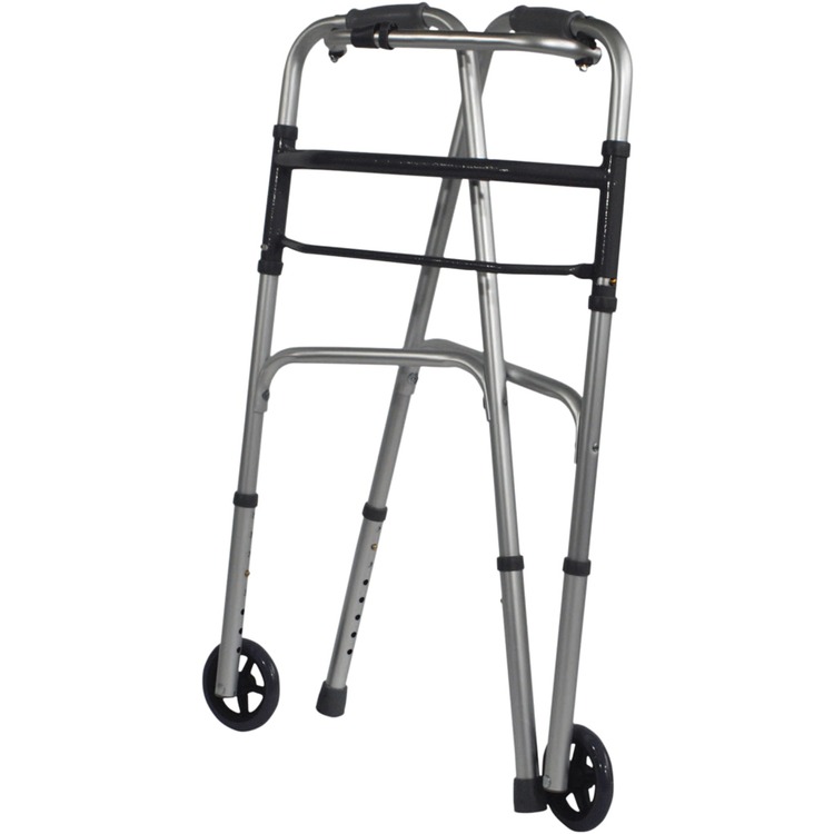 Walking frame features soft grip handles, one button folding function and height adjustable legs.