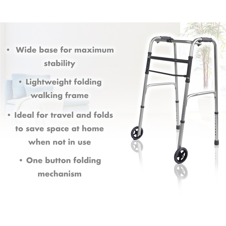 Lightweight Aluminium Folding Walking Frame with wheels and a wide base for maximum stability, ideal for home use.