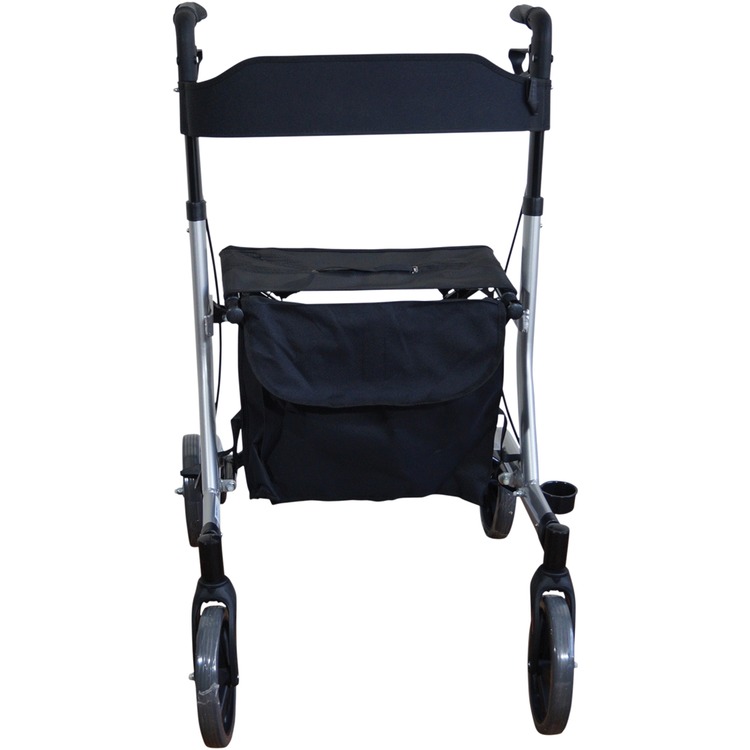 This four-wheeled rollator also features an integral robust canvas seat, padded backrest and an integral walking stick holder. A handy, detachable shopping bag is included for storing small items.