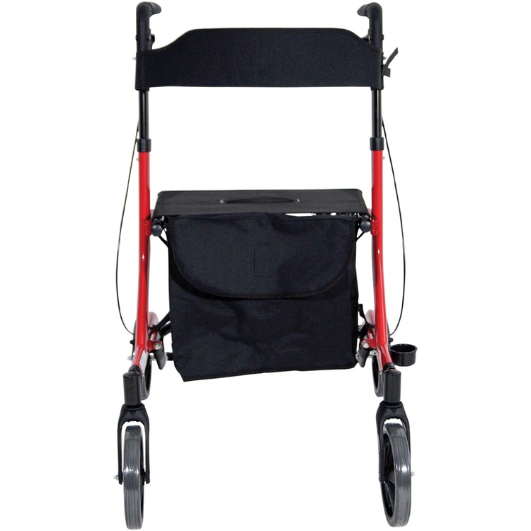 This four-wheeled rollator also features an integral robust canvas seat, padded backrest and an integral walking stick holder. A handy, detachable shopping bag is included for storing small items.