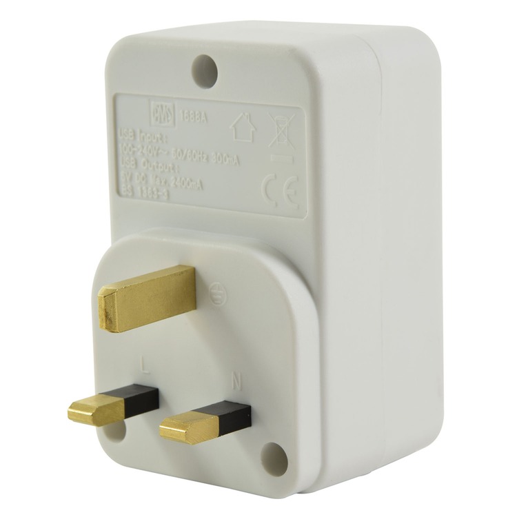 Plug through UK Mains Adaptor with Dual USB A Ports 2.4A Max