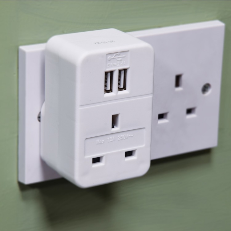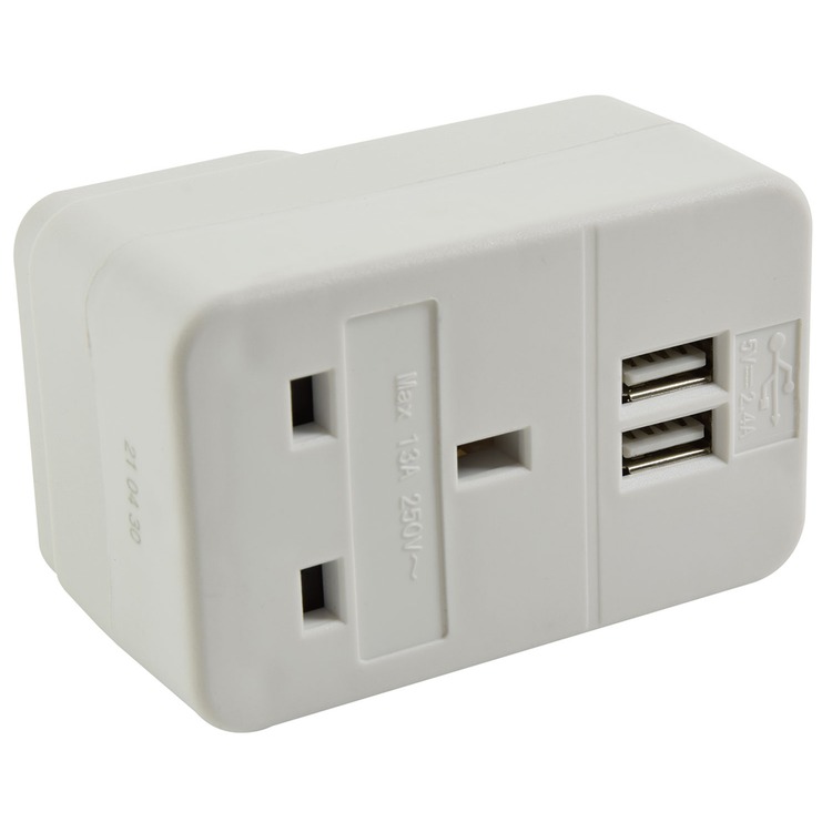 A plug through UK mains adaptor with two USB ports which simply plugs into an existing 13A UK mains socket, adding USB ports for charging portable devices.