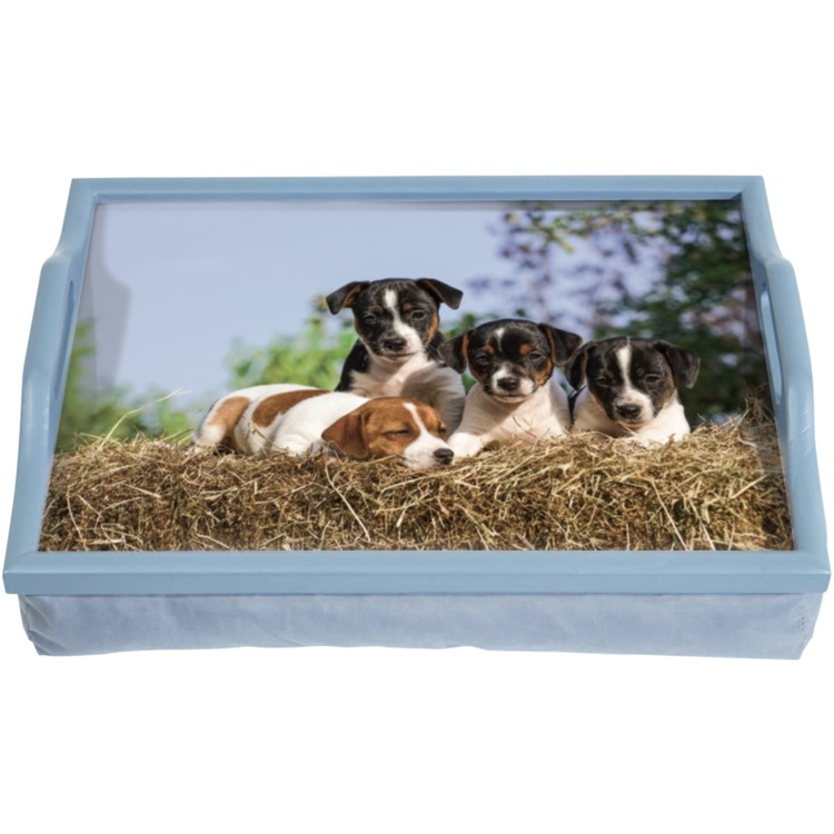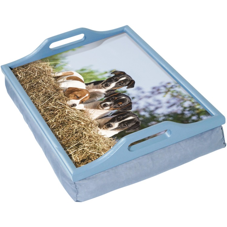 This attractive and functional Lap Tray with a puppy design makes breakfast in bed, reading, writing and crafts easy and comfortable. The lap tray has a built-in beanbag cushion below the tray top, finished in blue fabric, so will rest comfortably on your legs while you lie or sit. The table top surface has a pleasant design that will suit both modern and traditional homes and is laminated for easy cleaning. With built-in handles to more easily carry and position the Lap Tray.