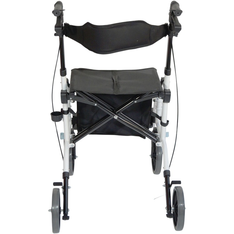 Features of the Duo Deluxe 2 in 1 Rollator include ergonomic handles, loop handled brakes with a park setting, built in seat, a padded backrest, a walking stick holder, a handy shopping bag with shoulder strap, easy folding mechanism for storage and transportation.