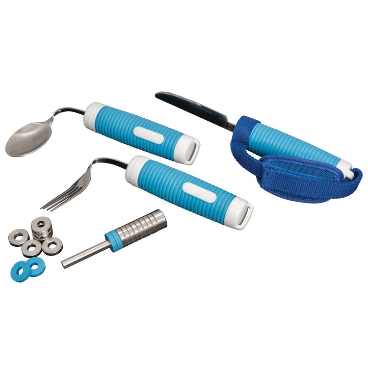 The Weight Adjustable Cutlery Set includes a fork, knife, spoon, strap, and set of weights.
