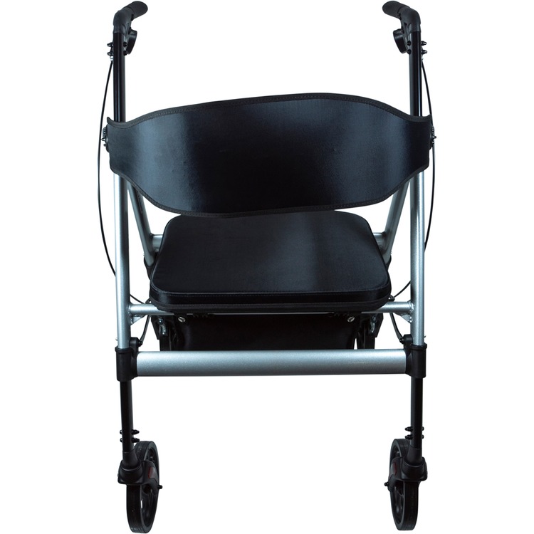 Robust silver frame heavy duty Rollator suitable for use on level floors either indoors or outdoors. Ergonomic height adjustable handles, user friendly push pin height adjustment, simple brake cable adjustment and swivelling 8" PVC front wheels.