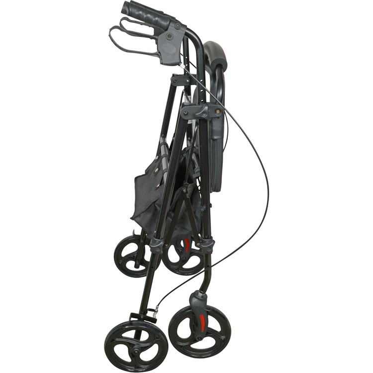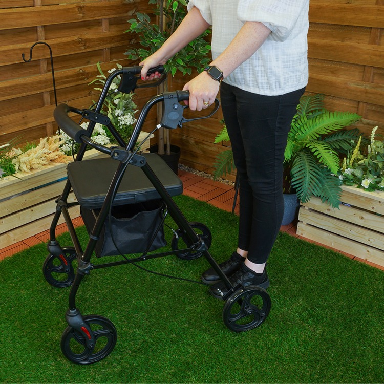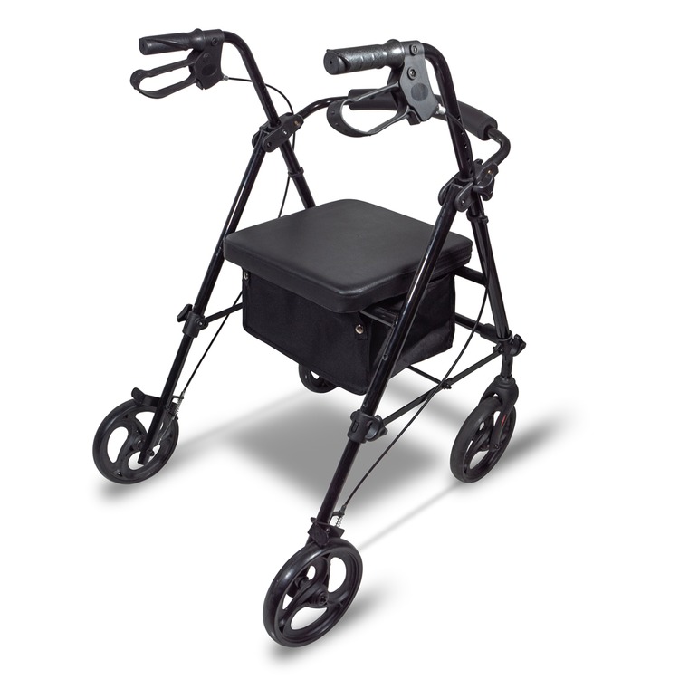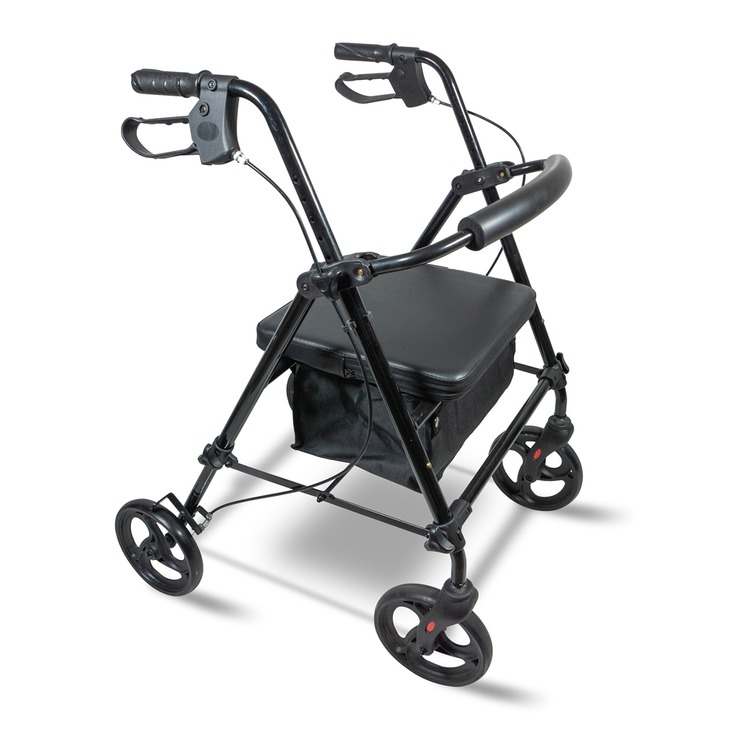 The Rollator has height adjustable ergonomic handles with brakes that push down to lock into a stationary position.