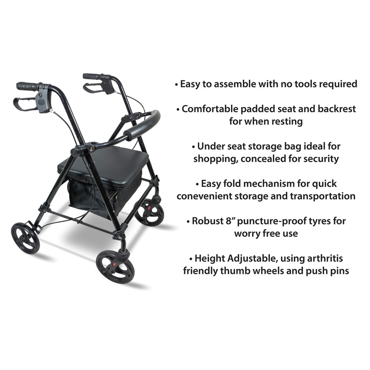 This lightweight yet durable rollator is constructed from a mix of steel and aluminum and has 8" solid puncture proof wheels.