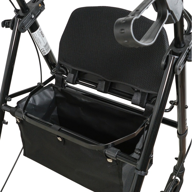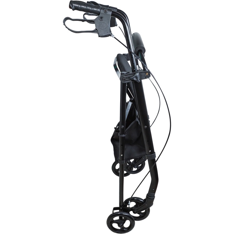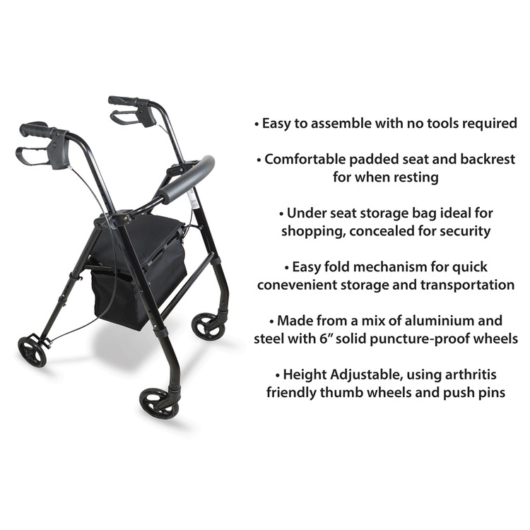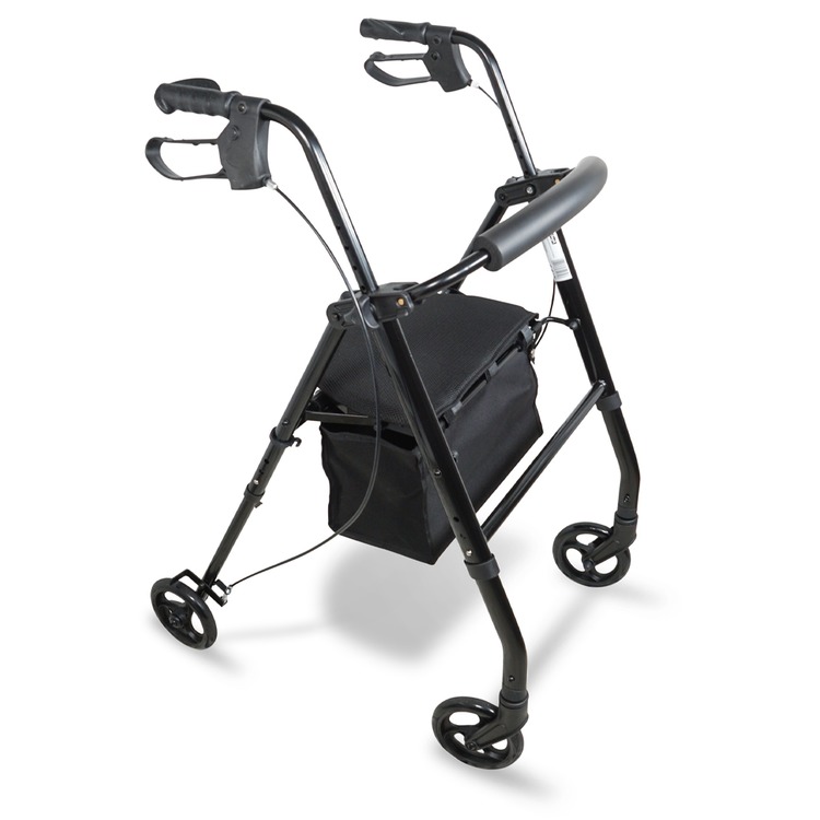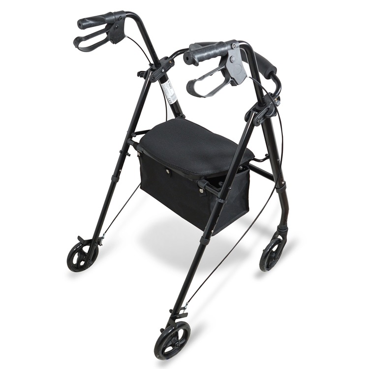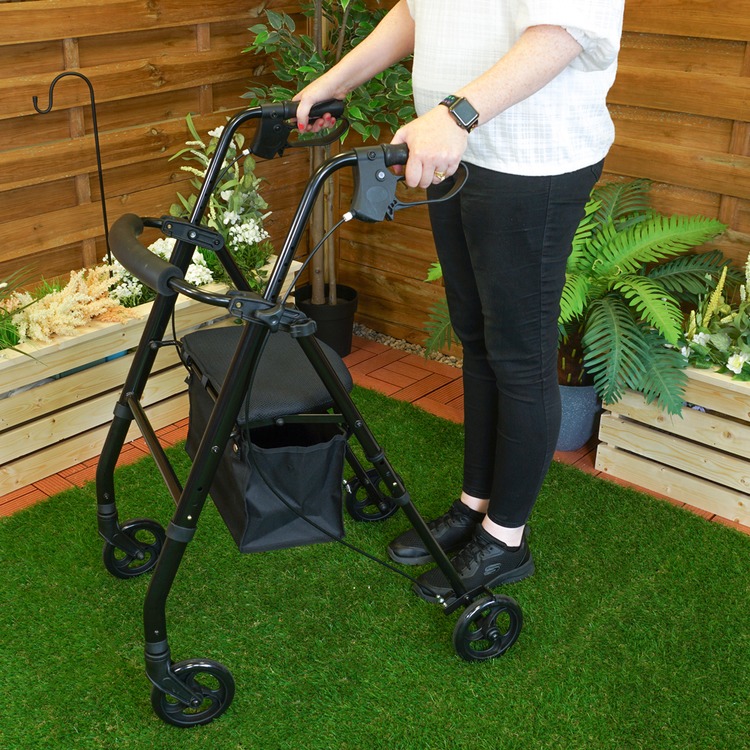 The Rollator has height adjustable ergonomic handles with brakes that push down to lock into a stationary position.