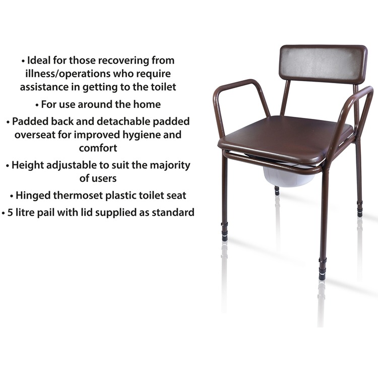 The Bedside Commode Chair has a removeable, 5 litre pail with lid and a padded overseat for discretion, when not in use. The upholstery of the commode is well padded and is vinyl welded to reduce the possibility of bacteria build up. It is easily wipe cleaned with a mild detergent.