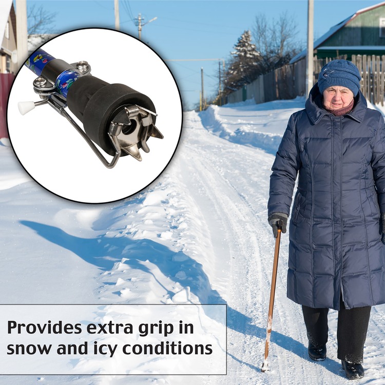 Easily installable on your existing walking stick, this accessory provides unmatched grip on snow and icy conditions when making essential journeys.