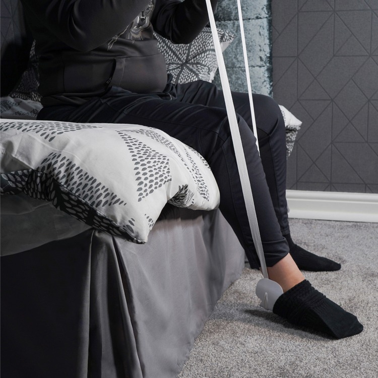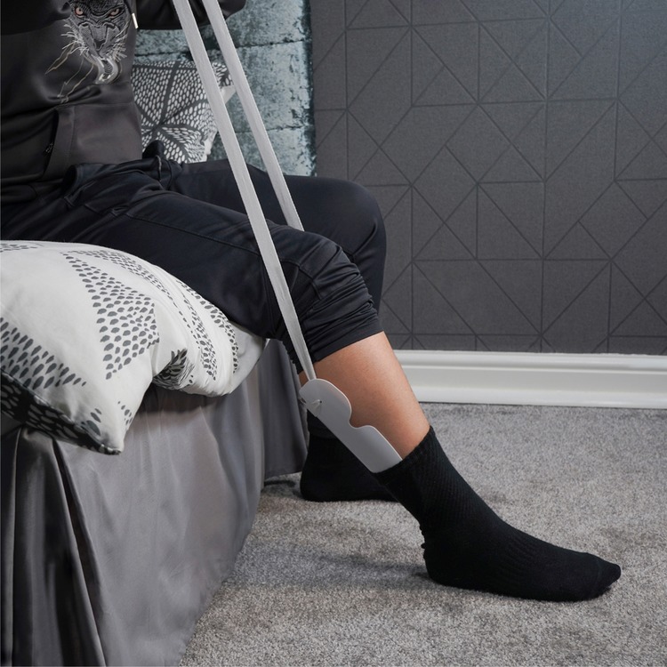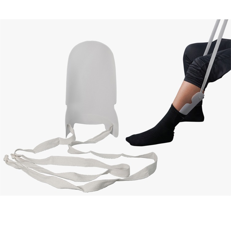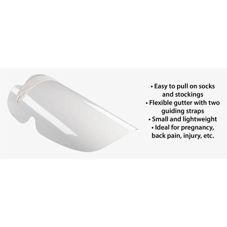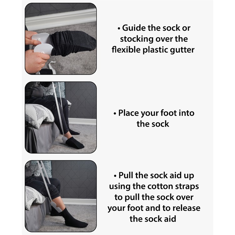 Simply guide your sock over the flexible plastic gutter, place the foot into the sock and then pull up the sock aid using the two cotton straps attached