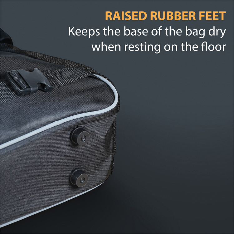 It is a practical and affordable scooter accessory that enables scooter users to safely carry more, while keeping their hands free. It is water resistant and features raised rubber feet on the base to keep the bottom of the bag dry when it is resting on the floor.