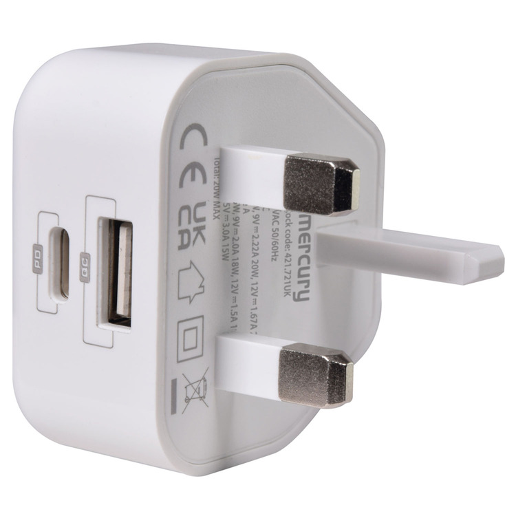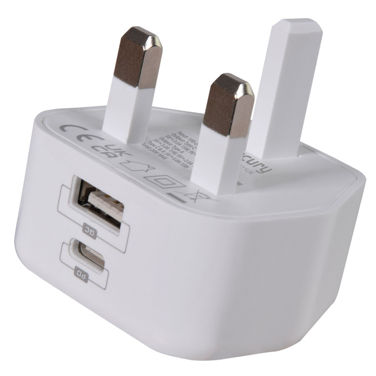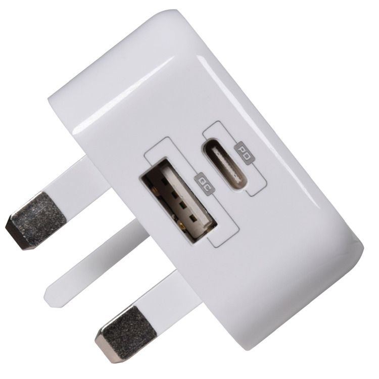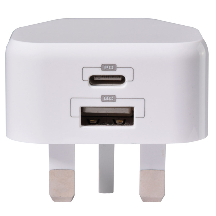 Compact universal 20W UK mains charger compatible with any USB-A or USB-C device. Featuring PPS, PD3.0 and QC3.0 technology, this charger will fast charge your iPhone 8 or later with 50% battery in approximately 30 minutes.