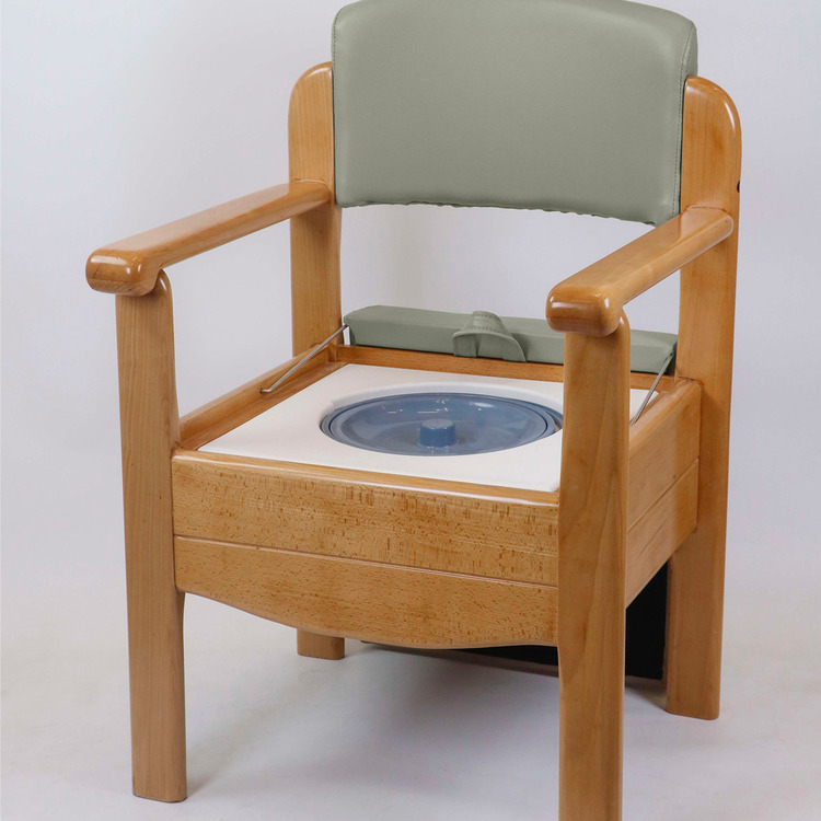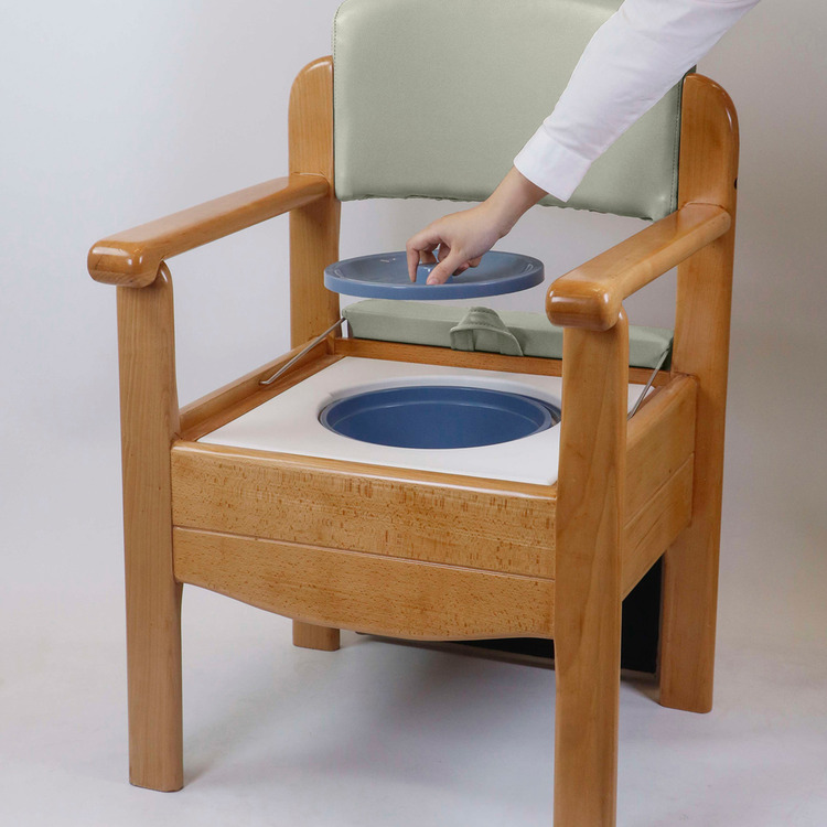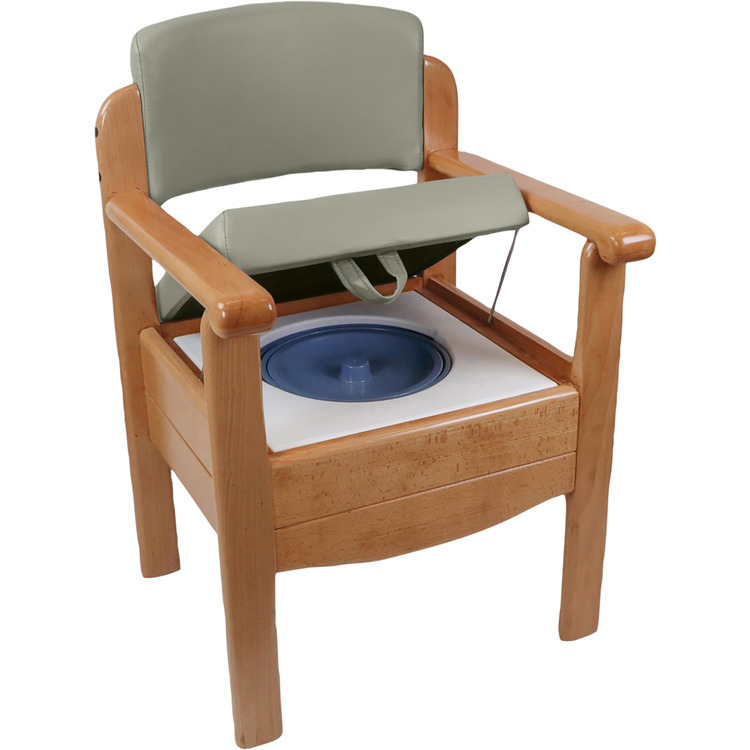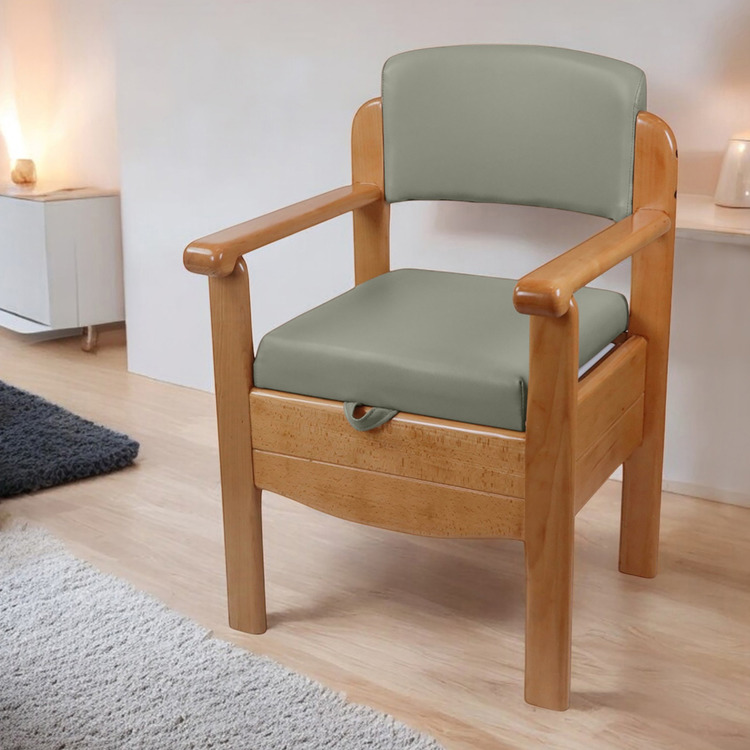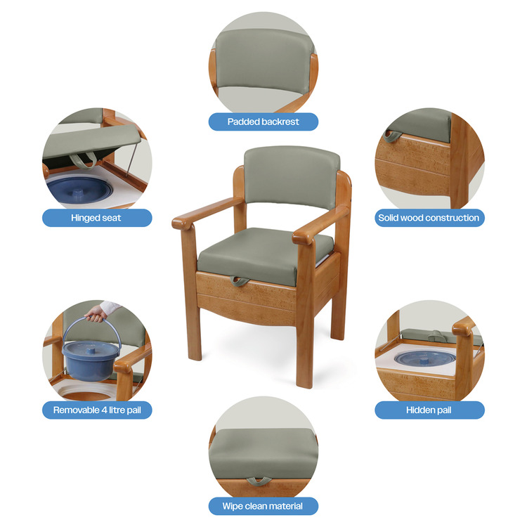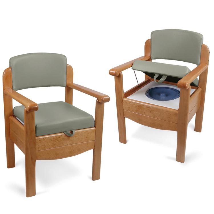 Crafted with chunky wood construction and padded seat/backrest, this commode resembles a classic wooden chair, making it a stylish addition to any room