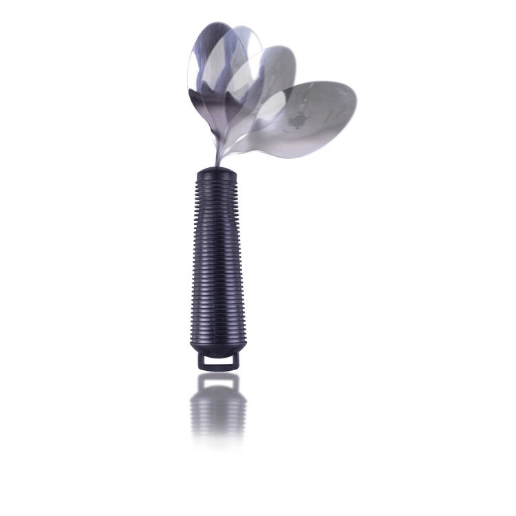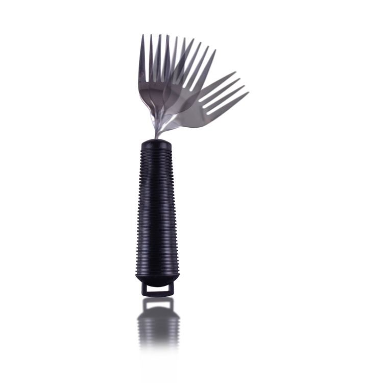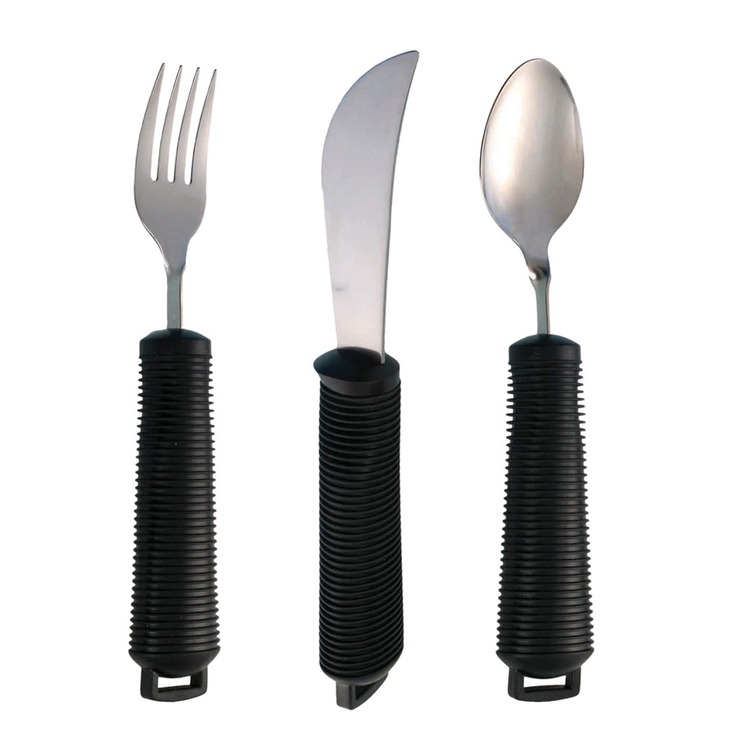 The bendable spoon, fork and rocker knife all have a fixed loop at the end of the wide, soft cushion handle, through which the utensil strap can be passed to secure the dining aid utensil to the users hand.