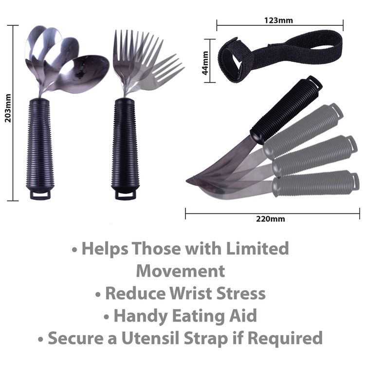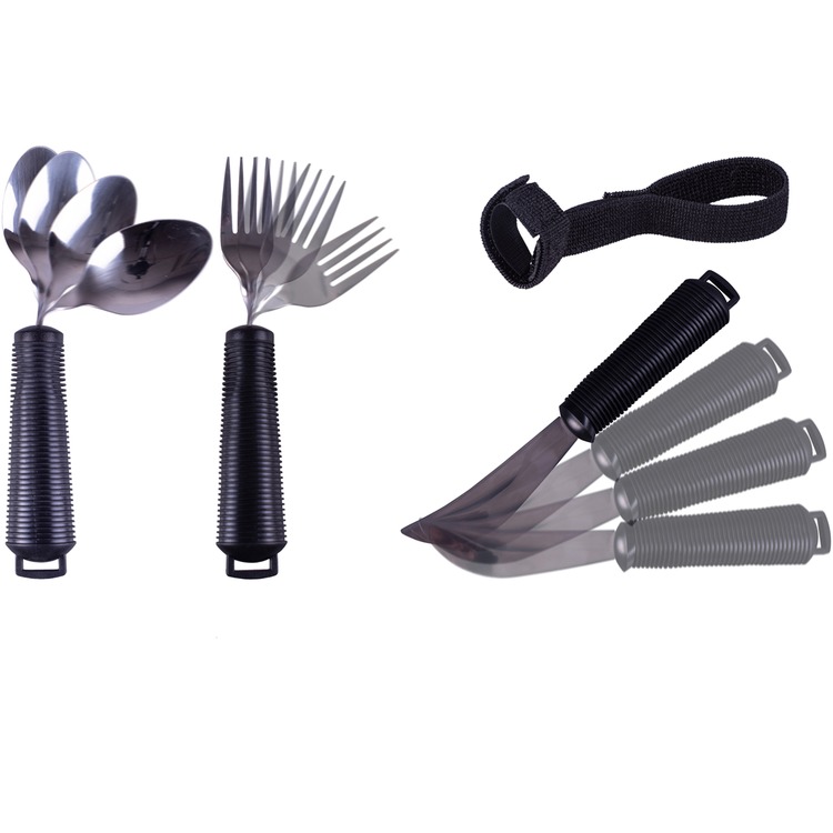 A Dining aid set consisting of a bendable spoon, bendable fork and a rocker knife, together with 3 utensil straps.