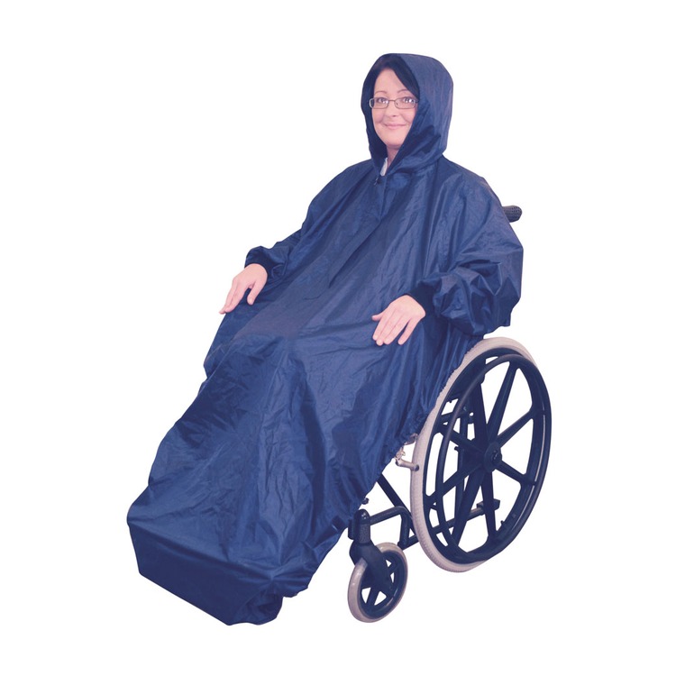 This blue waterproof Wheelchair Mac with Sleeves is the ideal accessory/garment to provide head to toe protection for you and your wheelchair.
