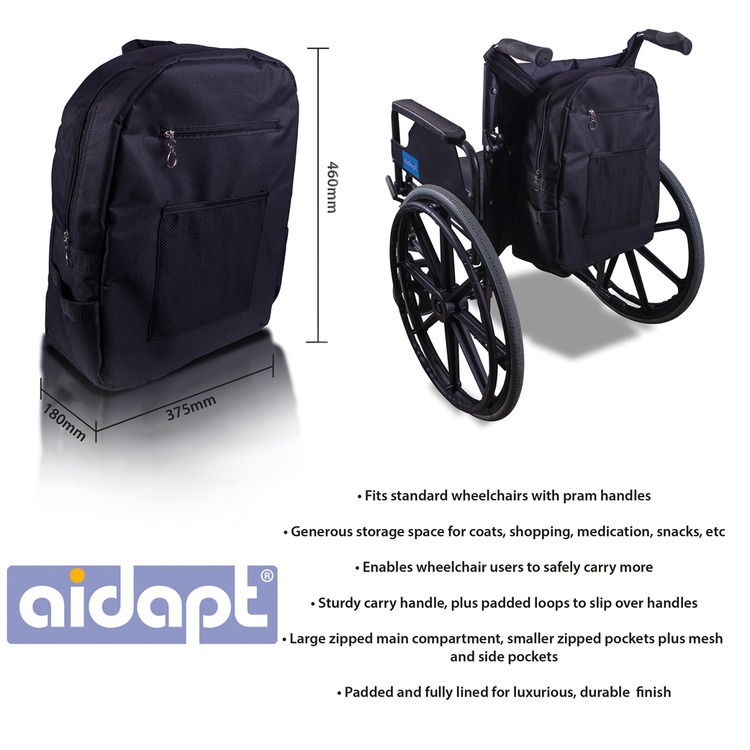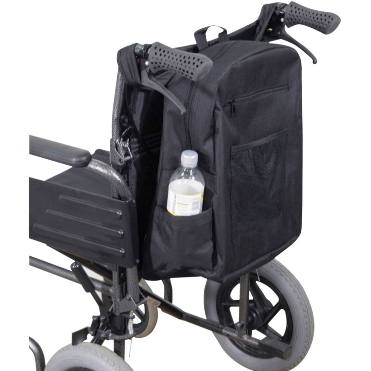 The Deluxe Lined Wheelchair Bag has been specially designed to fit neatly onto the rear of most standard wheelchairs with pram handles and provides multiple zipped storage spaces ideal for larger or small items such as jackets, shopping, medication, money, identification, snacks, etc.