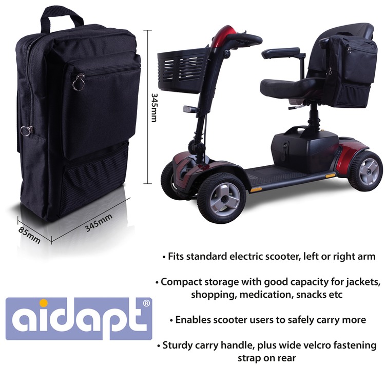 The Wheelchair Pannier Bag has been specially designed to fit neatly over the armrest of most wheelchairs and provides storage space for jackets, shopping, medication, snacks, etc.