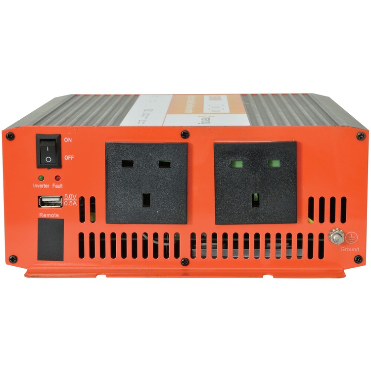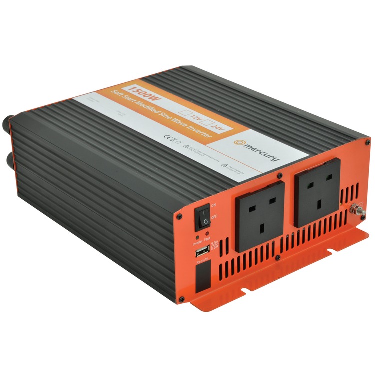 This 1500W high efficiency power inverter uses a modified sine wave to power 230V mains equipment and USB power from a 12V battery or DC power supply.